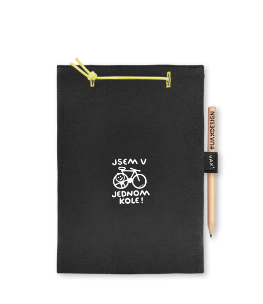 Blok A4 s vyměnitelnými papíry. Na přední straně možnost výběru z více než 300 potisků. Vyrobeno ze 100% bavlny. Výběr z 28 barev. Tiskneme ručním sítotiskem. V horní části blok A4 stažen žlutou gumičkou. 60 listů s perforací pro snadnější odtržení. Žlutá guma ve spodní části pro zajištění obalu. K bloku získáte i tužku #UAXDESIGN