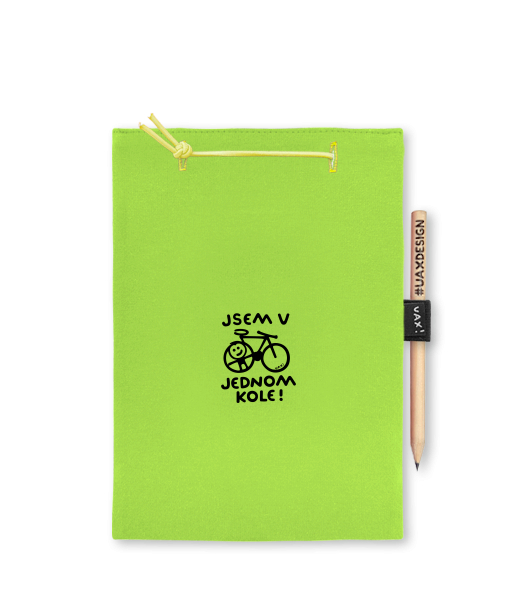 Blok A4 s vyměnitelnými papíry. Na přední straně možnost výběru z více než 300 potisků. Vyrobeno ze 100% bavlny. Výběr z 28 barev. Tiskneme ručním sítotiskem. V horní části blok A4 stažen žlutou gumičkou. 60 listů s perforací pro snadnější odtržení. Žlutá guma ve spodní části pro zajištění obalu. K bloku získáte i tužku #UAXDESIGN