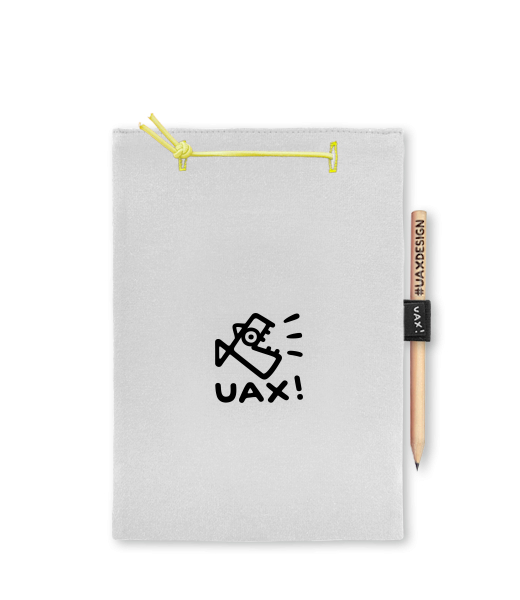 Blok A4 s vyměnitelnými papíry. Na přední straně možnost výběru z více než 300 potisků. Vyrobeno ze 100% bavlny. Výběr z 28 barev. Tiskneme ručním sítotiskem. V horní části blok A4 stažen žlutou gumičkou. 60 listů s perforací pro snadnější odtržení. Žlutá guma ve spodní části pro zajištění obalu. K bloku získáte i tužku #UAXDESIGN