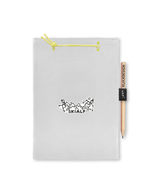 Blok A5 s vyměnitelnými papíry. Na přední straně možnost výběru z více než 300 potisků. Vyrobeno ze 100% bavlny. Výběr z 28 barev. Tiskneme ručním sítotiskem. V horní části blok A5 stažen žlutou gumičkou. 60 listů s perforací pro snadnější odtržení. Žlutá guma ve spodní části pro zajištění obalu. K bloku získáte i tužku #UAXDESIGN