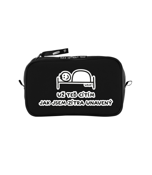 Unisex UAX kosmetická taška velikosti M s potiskem a kapsou s potiskem 1200 UŽ TEĎ CÍTÍM JAK JSEM ZÍTRA UNAVENÝ v barvě BLACK
