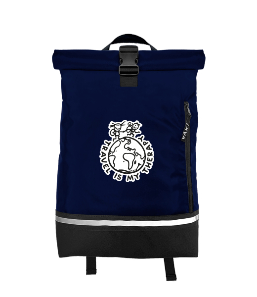 Originální batoh ROLL-TOP SMALL s potiskem 1240 TRAVEL IS MY THERAPY v barvě MIDNIGHT BLUE