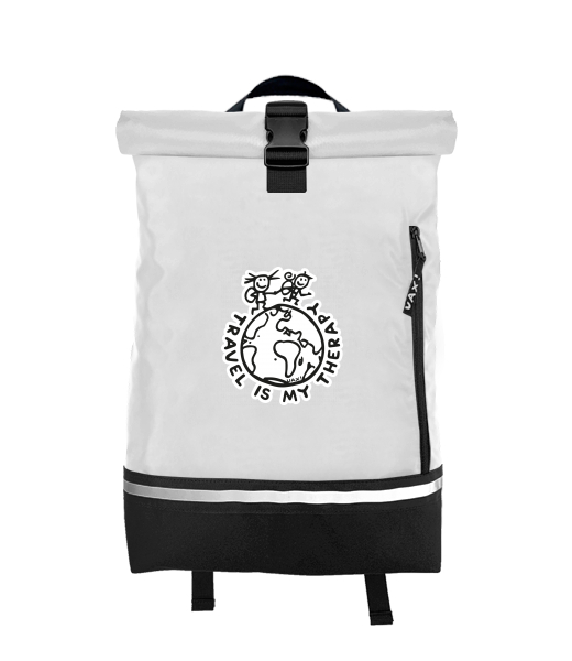 Originální batoh ROLL-TOP SMALL s potiskem 1240 TRAVEL IS MY THERAPY v barvě WHITE