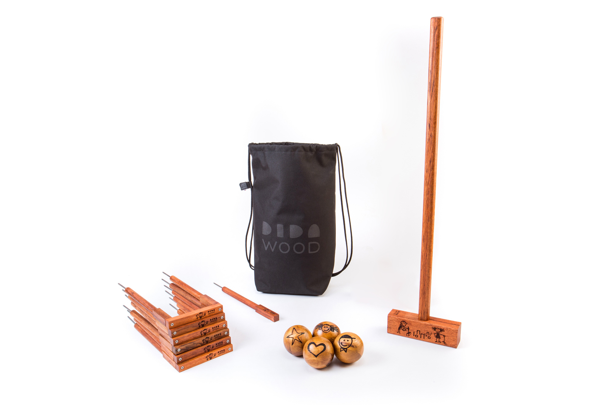 Kvalitní sada Golf kroket UAX s jedním kladivem pro 2-4 hráče. Obsah sady je 6x branka, 1x kolík, 4x koule, 1x hůl s kladivem. Společenské hry, které s sebou nesou zodpovědnost? Přesně takový je GOLF Kroket UAX, díky nápadu designerky Kovocité Mga.Moniky Lackové, která stojí za zrodem DIDAWOOD.