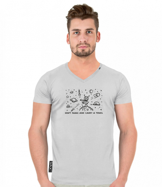 Pánské tričko SLIM FIT s výstřihem do V pro muže s potiskem 1156 DON'T PANIC GALAXY v barvě CEMENT