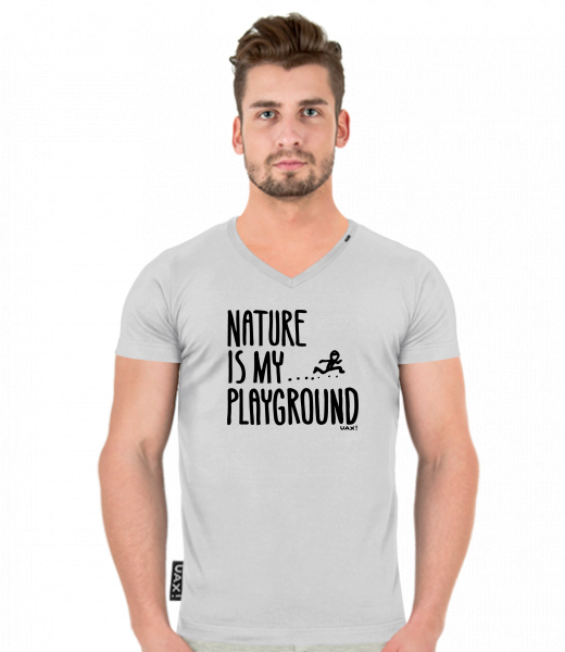 Pánské tričko SLIM FIT s výstřihem do V pro muže s potiskem 1160 NATURE IS MY PLAYGROUND v barvě CEMENT