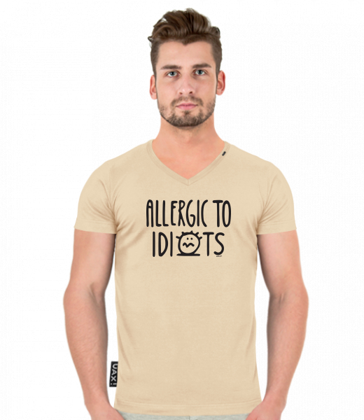 Pánské tričko SLIM FIT s výstřihem do V pro muže s potiskem 1354 ALLERGIC TO IDIOTS v barvě CARAMEL