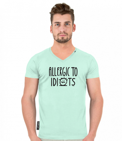 Pánské tričko SLIM FIT s výstřihem do V pro muže s potiskem 1354 ALLERGIC TO IDIOTS v barvě MINT
