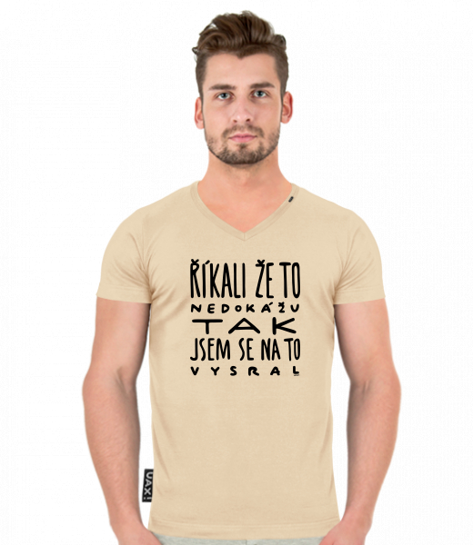 Pánské tričko SLIM FIT s výstřihem do V pro muže s potiskem 1366 ŘÍKALI ŽE TO NEDOKÁŽU TAK JSEM SE NA TO VYSRAL v barvě CARAMEL