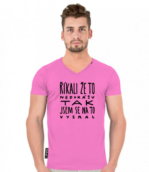 Pánské tričko SLIM FIT s výstřihem do V pro muže s potiskem 1366 ŘÍKALI ŽE TO NEDOKÁŽU TAK JSEM SE NA TO VYSRAL v barvě CLASSIC PINK
