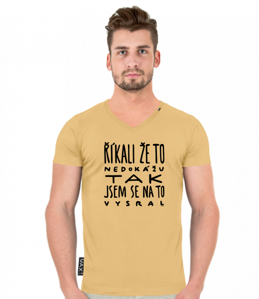 Pánské tričko SLIM FIT s výstřihem do V pro muže s potiskem 1366 ŘÍKALI ŽE TO NEDOKÁŽU TAK JSEM SE NA TO VYSRAL v barvě MUSTARD
