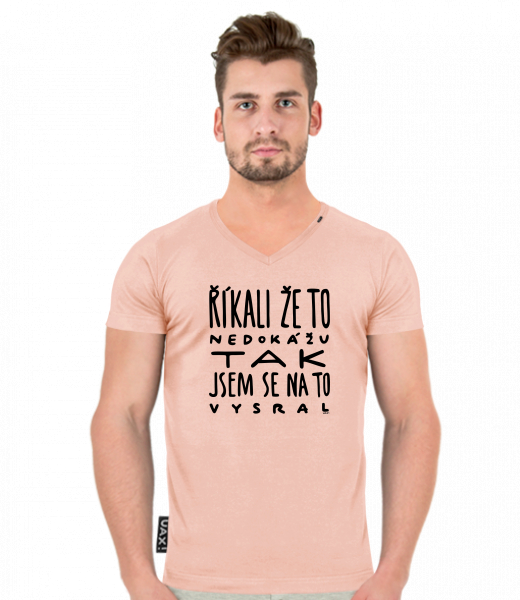 Pánské tričko SLIM FIT s výstřihem do V pro muže s potiskem 1366 ŘÍKALI ŽE TO NEDOKÁŽU TAK JSEM SE NA TO VYSRAL v barvě PEACH