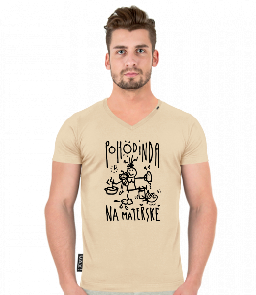 Pánské tričko SLIM FIT s výstřihem do V pro muže s potiskem 1383 POHODINDA v barvě CARAMEL