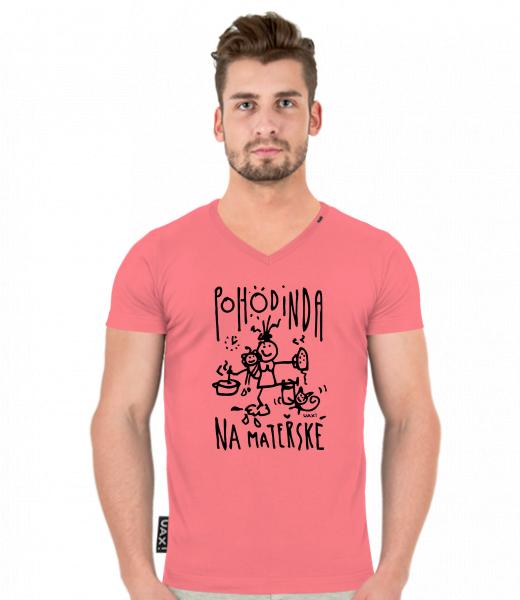 Pánské tričko SLIM FIT s výstřihem do V pro muže s potiskem 1383 POHODINDA v barvě LOSOSOVA