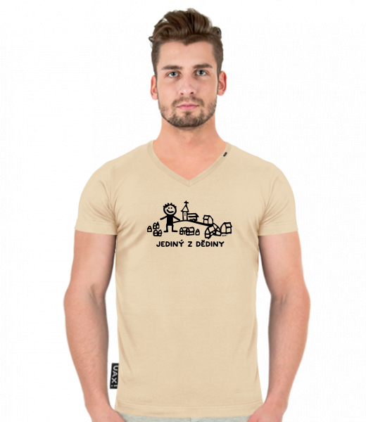 Pánské tričko SLIM FIT s výstřihem do V pro muže s potiskem 1393 JEDINÝ Z DĚDINY v barvě CARAMEL