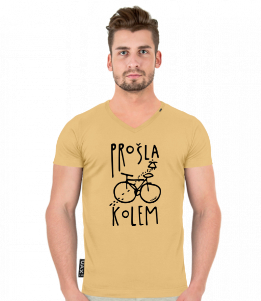 Pánské tričko SLIM FIT s výstřihem do V pro muže s potiskem 1395 PROŠLA KOLEM v barvě MUSTARD