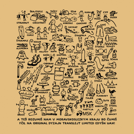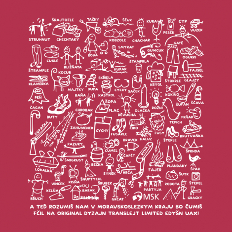 „"Limited edyšn z Moravskoslezkeho kraja Verze 2.0". Kancelář hejtmana Moravskoslezského kraje má v plánu u nás objednat kopu triček, pro prezentaci kraje. Oceňujeme přístup, který vede k podpoře drobných podnikatelů a řemesel v kraji! Už se nebude nakupovat vášnivě prý v Asii!!! Tož super ne? A tak tu v UAX na tom dizajnu a dalších, robíme! Fčil si ho mužeš kupit za chechtaky tu!“