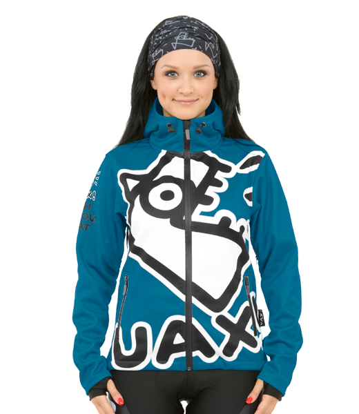 Originální dámská softshellová bunda s kapucí a potiskem UAX! Fish z vodě a větru odolného materiálu. Vodě odolné zipy, odvětrání v podpaží a elastické rukavičky s dírou na palec.