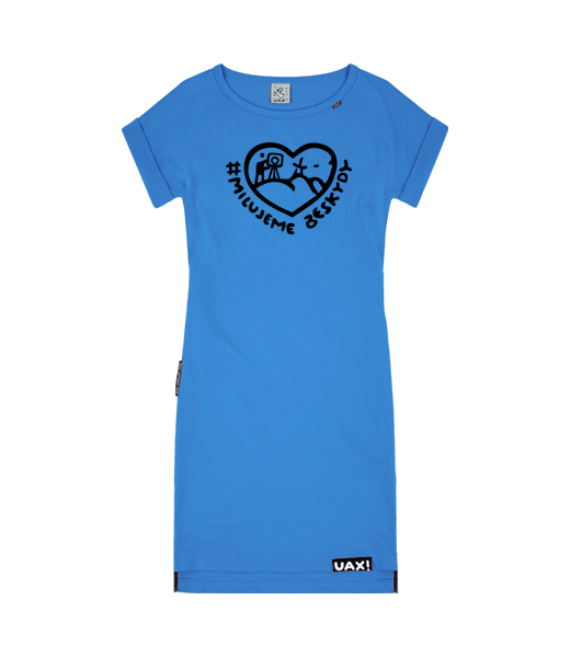 Vyrábíme udržitelné oblečení UAX! - ručně šité v Česku uaxŽeny uaxVšechny produktyŠatyDÁMSKÉ ŠATY BASICpotisk 1356 - MILUJEME BESKYDY 2CAPRI BLUE