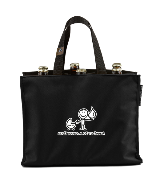 BEER CARRIER - bag for beer with design 1081 STAČÍ KAPKA A UŽ TO ŤAPKÁ in color BLACK