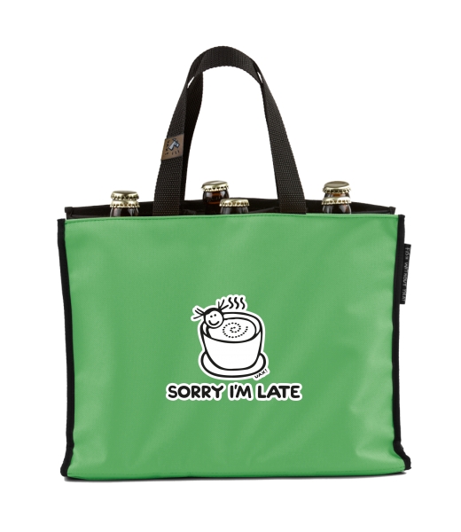 BEER CARRIER - bag for beer with design 1087 SORRY IM LATE in color BRIGHT GREEN