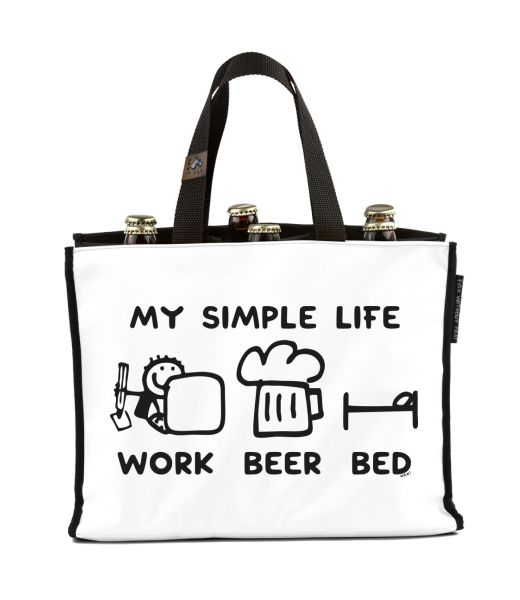 BEER CARRIER - bag for beer with design 1211 MY SIMPLE LIFE WORK BEER BED in color WHITE