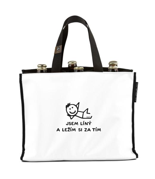 BEER CARRIER - bag for beer with design 1217 JSEM LÍNÝ A LEŽÍM SI ZA TÍM in color WHITE