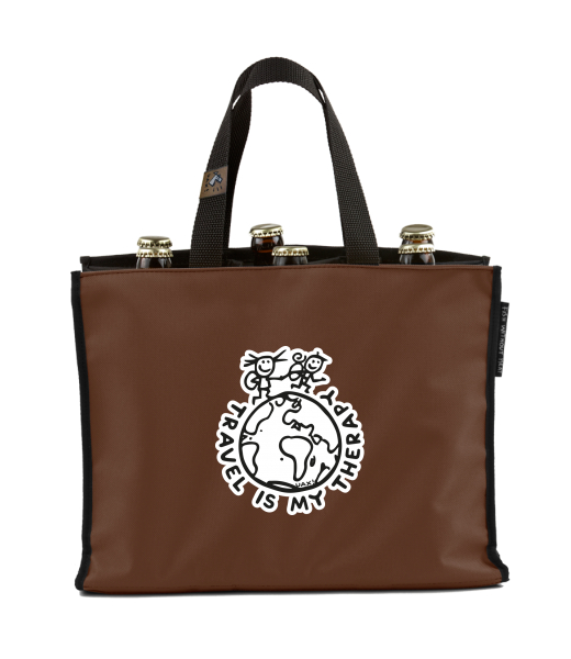 BEER CARRIER - bag for beer with design 1240 TRAVEL IS MY THERAPY in color BROWN SUGAR