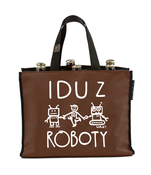 BEER CARRIER - bag for beer with design 1377 IDU Z ROBOTY 2 in color BROWN SUGAR
