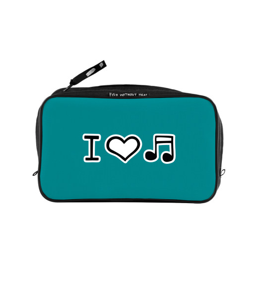 UAX Unisex sizes XL cosmetic bag with printing and pocket with design 1067 I LOVE MUSIC in color TURQUOISE