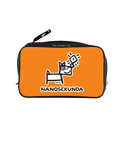 UAX Unisex sizes XL cosmetic bag with printing and pocket with design 516 NANOSEKUNDA in color SIGNAL ORANGE