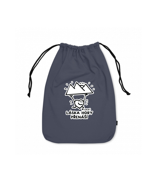 Large cotton pouch with design 1264 LÁSKA HORY PŘENÁŠÍ in color GRAY INK