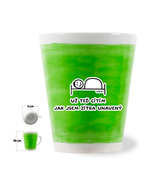 The original LATTE CUP UAX! a volume of 0.25L with design with design 1200 UŽ TEĎ CÍTÍM JAK JSEM ZÍTRA UNAVENÝ in color PARROT GREEN