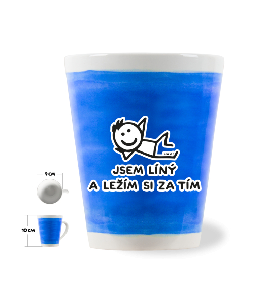 The original LATTE CUP UAX! a volume of 0.25L with design with design 1217 JSEM LÍNÝ A LEŽÍM SI ZA TÍM in color DARK BLUE