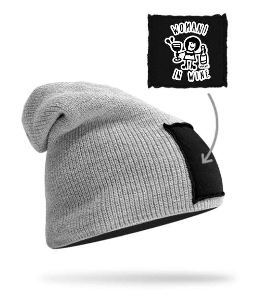 Quality knitted hat BEANIE unisex with design 1347 WOMAN IN WINE 2 in color GREY/BLACK