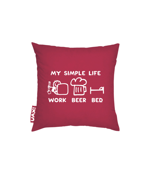 Pillow cover 50x50 with design 1211 MY SIMPLE LIFE WORK BEER BED in color CHILLY PEPPER RED