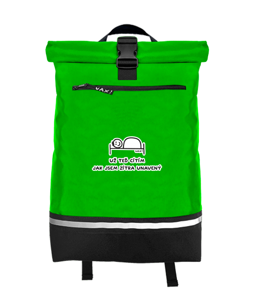 Original backpack ROLL-TOP LARGE with design 1200 UŽ TEĎ CÍTÍM JAK JSEM ZÍTRA UNAVENÝ in color BRIGHT GREEN