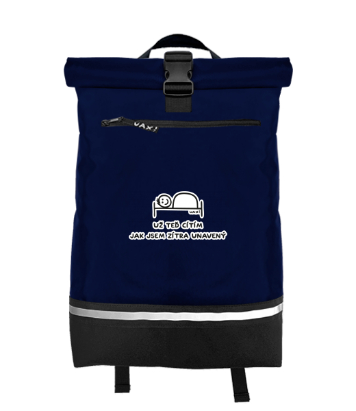 Original backpack ROLL-TOP LARGE with design 1200 UŽ TEĎ CÍTÍM JAK JSEM ZÍTRA UNAVENÝ in color MIDNIGHT BLUE