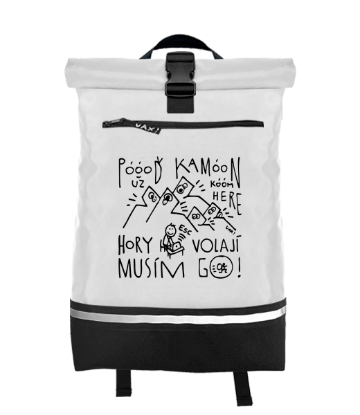 Original backpack ROLL-TOP LARGE with design 1368 POOOĎ KAMOON HORY MUSÍM JÍT GO in color WHITE