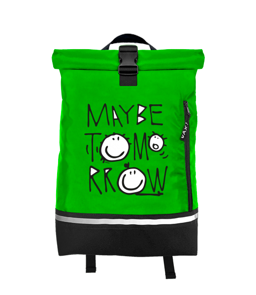 Original backpack ROLL-TOP SMALL with design 1001 MAYBE TOMORROW in color BRIGHT GREEN
