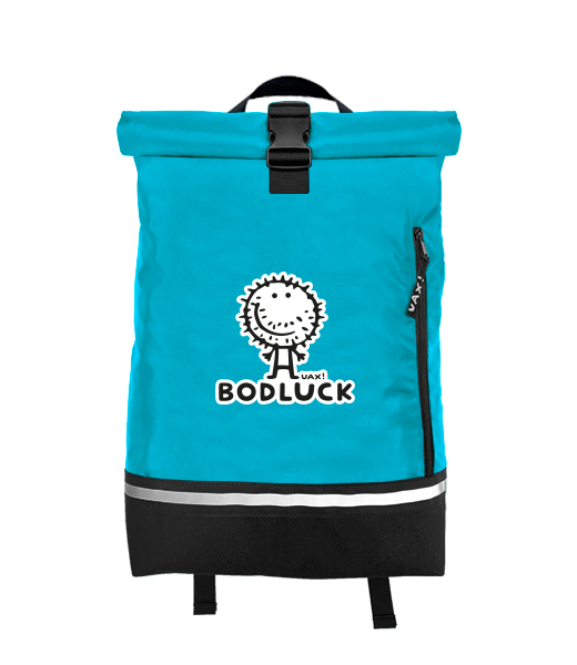 Original backpack ROLL-TOP SMALL with design 1002 BODLUCK in color BLUE ATOLL