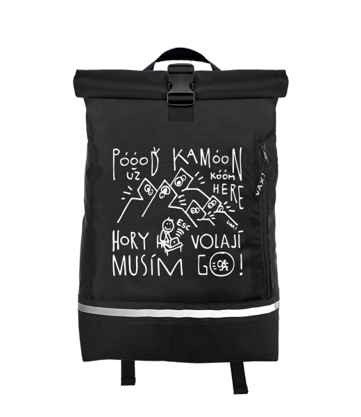 Original backpack ROLL-TOP SMALL with design 1368 POOOĎ KAMOON HORY MUSÍM JÍT GO in color BLACK