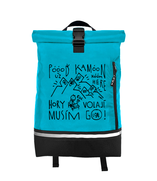 Original backpack ROLL-TOP SMALL with design 1368 POOOĎ KAMOON HORY MUSÍM JÍT GO in color BLUE ATOLL