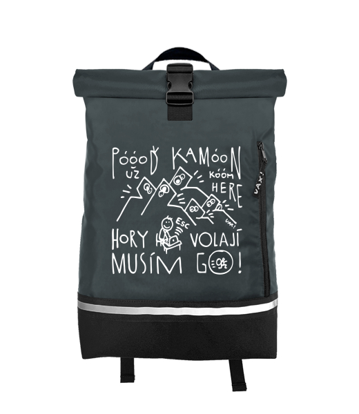 Original backpack ROLL-TOP SMALL with design 1368 POOOĎ KAMOON HORY MUSÍM JÍT GO in color GREY INK