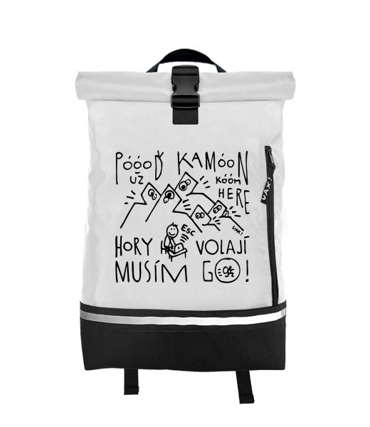 Original backpack ROLL-TOP SMALL with design 1368 POOOĎ KAMOON HORY MUSÍM JÍT GO in color WHITE
