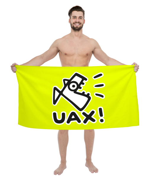 The original big towel imprinted with UAX! For printing big towels we use dye-sublimation technology guarantees excellent color saturation and an extensive range of colors. Big Towels UAX! We print on one side (the other side remains white and is used to blow-dry). One side of the big towel is 100% cotton for the drying of a second side big towel is 100% PES at that print printing! Wash at 60°C