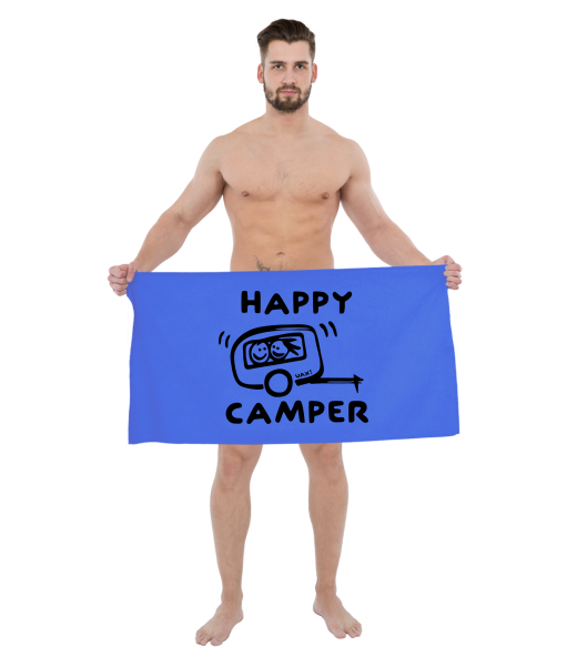The original towel imprinted with UAX! Ski collection with design 1116 HAPPY CAMPER in color CAPRI BLUE