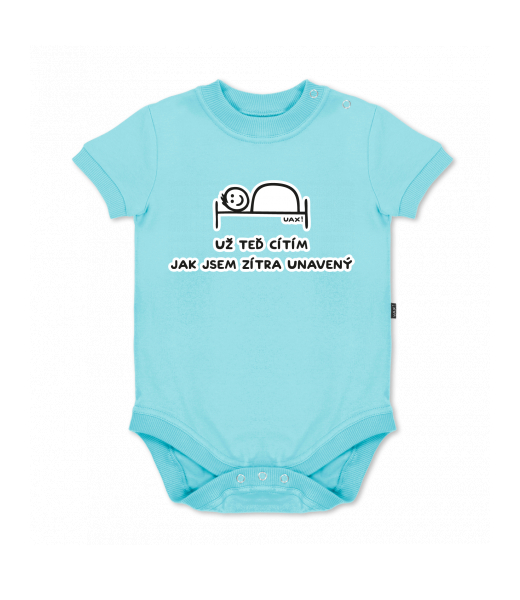 UAX baby body SHORT for kid with design 1200 UŽ TEĎ CÍTÍM JAK JSEM ZÍTRA UNAVENÝ in color PASTEL BLUE