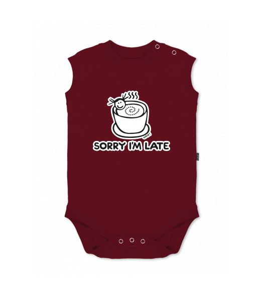 Baby body sleeveless with design for kid with design 1087 SORRY IM LATE in color DARK RED