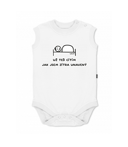 Baby body sleeveless with design for kid with design 1200 UŽ TEĎ CÍTÍM JAK JSEM ZÍTRA UNAVENÝ in color WHITE